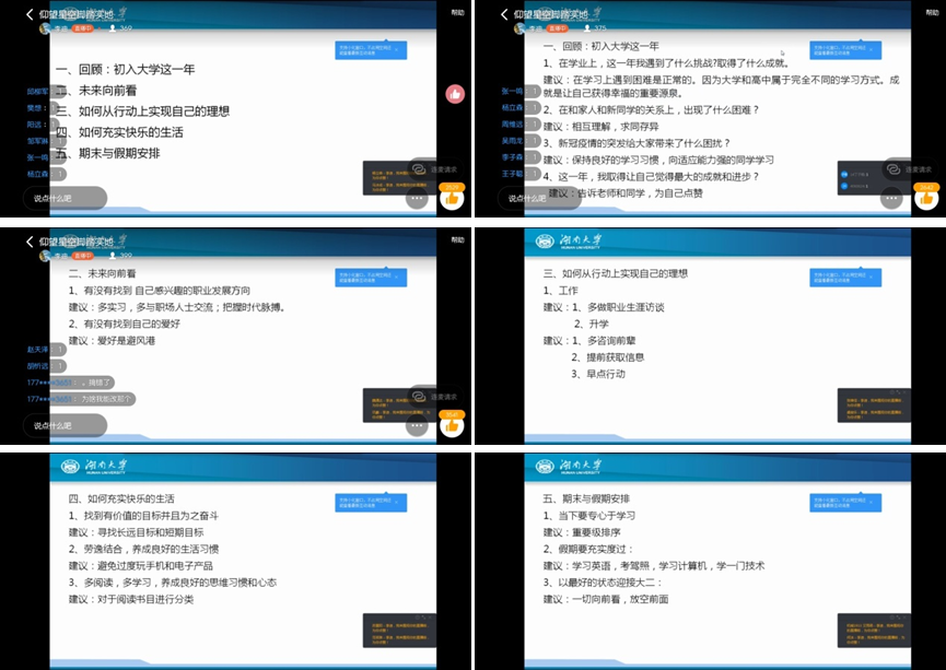 对于对初入大学一年的时光的回顾,李迪老师指出了在学业上同学们遇到了怎样的挑战和取得了怎样的成就,并给出了参考的建议,希望同学们可以在挑战中进一步明确学习上的目标;同时,对于处理人际关系上,从如何家长和同学建立良好的关系提出了“相互理解,求同存异”的意见。其次在新冠肺炎期间,同学们所遇到的困扰进行疏导,引导同学们培养和保持良好的学习习惯,和较强的适应能力。
