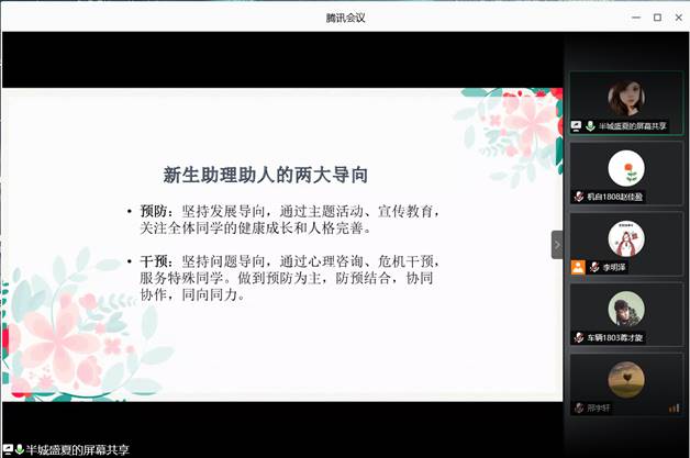 7月31日下午17:00,必赢bwin线路检测中心新生助理培训第二期课程顺利开展。本次培训的主题是心理健康教育,机械院2020级本科生辅导员李明泽老师、叶胜老师指导组织,辅导员闫智琪老师主讲,全体新生助理参与培训。
