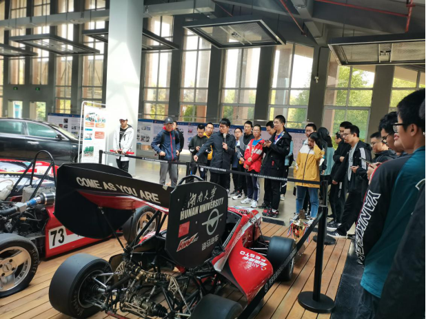 最后的重磅是参观湖大赛车队的赛车,我校电动方程式赛车队荣获2019赛季“蔚来杯”中国大学生电动方程式大赛的冠军。在此次比赛中,我校还取得了最快车检奖第二名、营销答辩第四名、成本答辩第三名、直线加速第三名、耐久测试第五名、电池箱设计第二名、轻量化第一名等奖项,共赢得奖金约472000元。