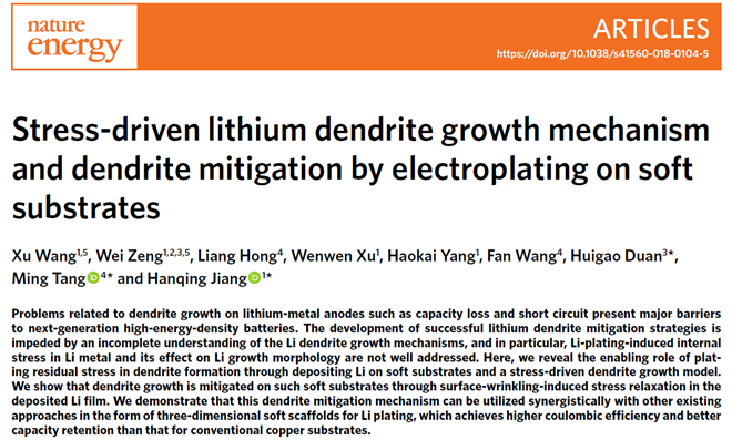 与前人的工作不同,本合作论文提出了一种全新的以软基材料释放应力来解决枝晶生长的方案。通过实验观测和理论模型,该项工作从全新的力学角度揭示了金属锂电池发展的最大障碍之一锂枝晶的产生机制,系统研究了压应力在锂电化学沉积过程中的产生、释放以及对枝晶形成的影响,建立了解释和预测这一过程的理论模型,并提出了可行的解决方案。结合合作团队开发的3D微孔柔性基底制造新方法,论文展示了该枝晶问题解决方案可大幅提升锂金属电池的性能,为锂金属电池的研究提供了全新的视角。