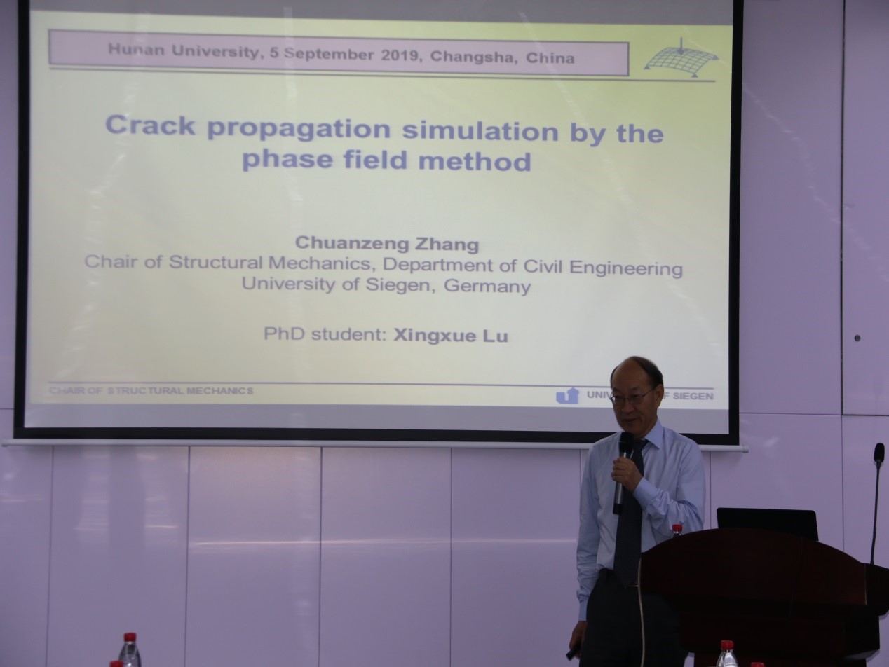 9月5日上午,欧洲科学院院士,德国锡根大学教授,著名力学专家张传增教授应邀在必赢bwin线路检测中心316报告厅作了题为《Crack propagation simulation by the phase field method》的报告,必赢bwin官网执行院长姜潮教授主持了报告会。
