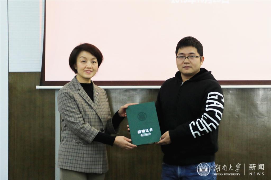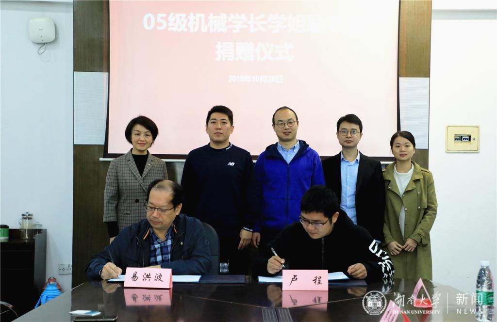 捐赠方代表、机械院05级车辆工程专业校友卢程,机自专业校友曹立雄、伍奕桦,工业工程专业校友李久国,热能专业校友李玉强,机械院师生代表、学校教育基金会相关负责人出席捐赠仪式。
