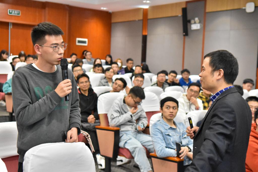 讲座中途,为了向大家传授如何更准确的解释、科普自己的研究时,段教授从在座听众中随机选择了一位同学,请他为大家介绍自己目前的研究内容。同学起初的发言略显羞涩与晦涩,但在段教授的引导下,最终清晰明了地向与会同学们解释了自己在结构设计方向上的具体研究,生动演示了简洁而又不简单的科普。