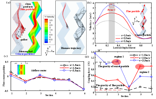 研究表明,颗粒和流体相分布不均,且存在环-核结构(图2a)。混合颗粒的运动过程为上升、沉降、再悬浮和分离。进一步的机理研究揭示:由于混合生物质的密度和尺寸存在差异,当入口风速为1.5 m/s时,清洁产品向上流动,杂质向下流动。随着表观气速的增加,混合颗粒的运输效率提高,但分离度降低。在最佳气速1.5 ~ 2.5 m/s的条件下,清洁产品和杂质得到有效分离(图2b)。研究深入分析了流化速率对分离纯度的影响,证明通道中心的颗粒具有良好的跟随性能,随流体呈Z字形运动(图2c),但倾向于沿壁面滑动。此外,混合颗粒的动态力行为受到通道截面尺寸的影响(图2d)。